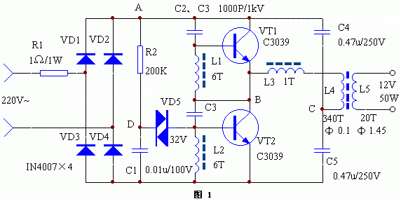 本電子變壓器工作原理與開關(guān)電源相似,電路原理圖見圖1(點擊下載原理圖),由VD1-VD4將市電整流為直流,再把直流變成幾十千赫茲的 高頻電流,然后用鐵氧休變壓器對高頻、高壓脈沖降壓。圖中R2、C1、VD5為啟動觸發(fā)電路。C2、C3、L1、L2、L3、VT1、VT2構(gòu)成高頻振蕩部分。