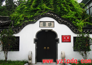 揚(yáng)州珍園在文昌中路,園門(mén)原在舊城九巷22號(hào),為清末鹽商李錫珍建。江都李伯通《過(guò)李氏珍園》詩(shī)云:“別業(yè)在城市,名園當(dāng)畫(huà)釁。小橋穿曲水,仙額聚方壺。有雨即飛瀑,無(wú)云多假山。水光浮瀲滟,石骨露嶙峋。”今園門(mén)東向,門(mén)額題篆體“珍園”二字。兩側(cè)筑花墻,開(kāi)漏窗數(shù)面。園東南側(cè)有湖石假山,山有洞曲,上筑盤(pán)道,下臨水池。
