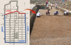唐羅城北城墻位置確定,留有后期擴(kuò)建跡象。在考古現(xiàn)場(chǎng),大小兩條探溝清晰可見,在地表向下40厘米左右的地方,一段古城墻遺址輪廓分明,但由于早些年磚瓦廠取土對(duì)城墻造成了嚴(yán)重破壞,僅留下基礎(chǔ)部分。夯窩、城墻磚、基槽……考古人員參照史料以及現(xiàn)場(chǎng)考古,發(fā)現(xiàn)東風(fēng)磚瓦廠附近為唐羅城東北角,這段東西走向的古城墻確為唐代羅城北城墻東段,而整個(gè)唐羅城北城墻東起東風(fēng)磚瓦廠,向西延伸,北折與子城東南角相接,全長(zhǎng)1470米。