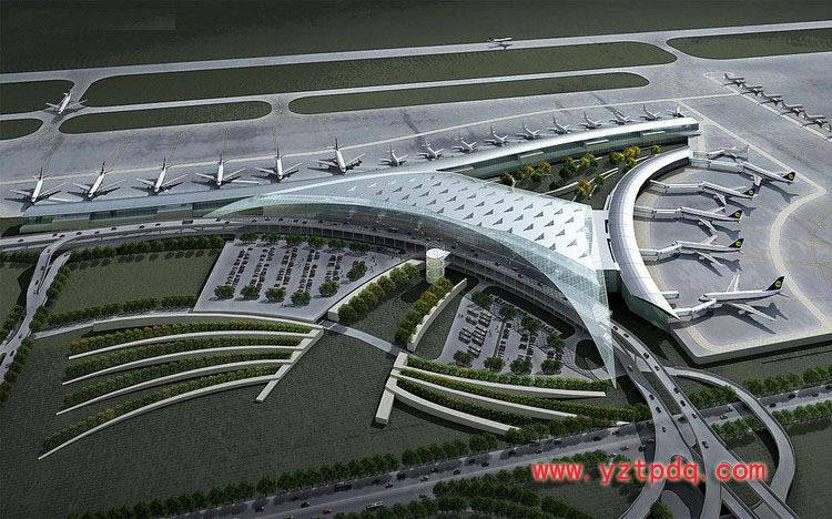 在機(jī)場航站樓效果圖上,作者發(fā)現(xiàn)航站樓平面形狀為扇形,地上二層,屋面為雙螺旋曲面構(gòu)造體系。據(jù)介紹,機(jī)場航站樓由美國蘭德隆與布朗有限公司設(shè)計(jì),建筑造型新穎,采用鋼結(jié)構(gòu)屋面,為斜交網(wǎng)格結(jié)構(gòu),具有三維動感立體視覺效果。在機(jī)場航站樓前,是一個半月形的人工湖。“月光下的一彎‘藍(lán)月’,像一面明鏡特別迷人,體現(xiàn)出‘天下三分明月夜,二分無賴是揚(yáng)州’的月亮文化特色。”施工人員介紹說。