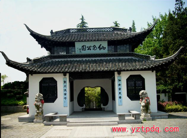 門(mén)廳與牌坊同處一條中軸線(xiàn)上,形為如意,游客一入園,即游園如意。進(jìn)門(mén)廳先是一小園,園中,以太湖石依地勢(shì)堆疊成花臺(tái),幾株翠竹點(diǎn)綴其間,恰到好處。園門(mén)—亡古篆“游仙”二字映入眼簾。進(jìn)入園門(mén),西部五疊泉,一支“玉液”從假山頂端跌落,出水處似為龍頭。水流不斷,水濺石響,如聞琴韻,泉旁山黃樹(shù)綠,溪旁仙女雕像亭亭玉立,淡裝,素裹,冰清玉潔。溪邊綠柳吻水,花木蔥蘢,把仙女映襯得楚楚動(dòng)人。