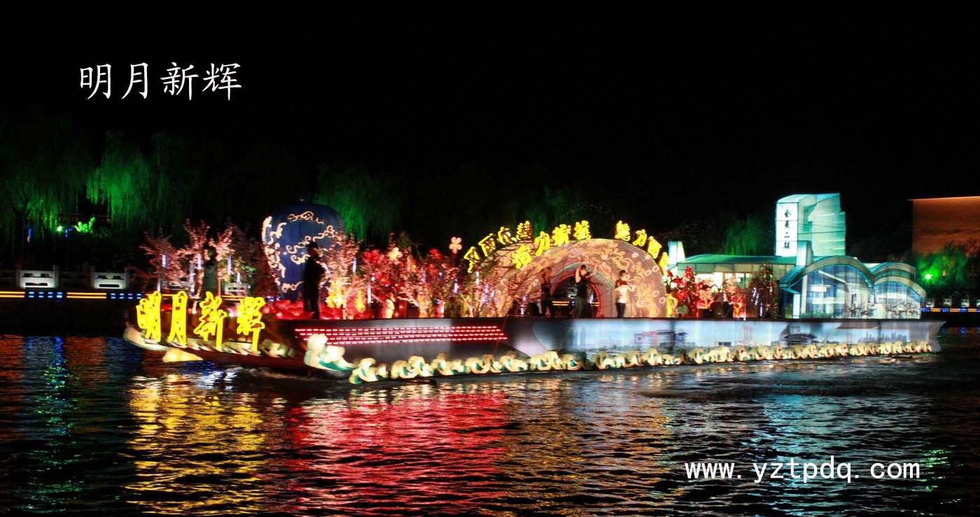 新城西區(qū)承制的“明月新輝”號(hào)花船,首先映入我們眼簾的是雙博館鎮(zhèn)館之寶“霽藍(lán)釉白龍梅瓶”,它是世界舉世無(wú)雙的珍稀國(guó)寶。瞧,在絢麗的燈光照耀之下,仿佛讓人們有了一種穿越揚(yáng)州2500年歷史的感覺。