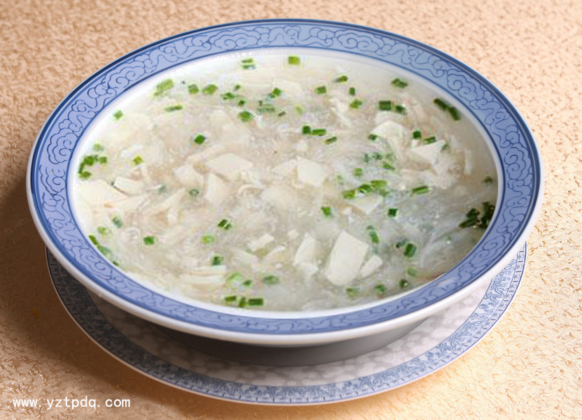 “雪花豆腐”菜名即珠湖雪浪。古代發(fā)明豆腐的是淮南王劉安,關(guān)于淮南王做豆腐的傳說很多:一說劉安在安徽淮南八公山上用大豆煉丹,偶然發(fā)現(xiàn)豆?jié){的凝固現(xiàn)象,逐漸試做出豆腐,在禪內(nèi)秘食,淮南王善于游禪交僧,一日嘗到了和尚們做的豆腐頓覺品味素新,便將豆腐的做法推廣到民間,相傳到各地;還有一說:淮南王劉安非常孝順父母,其母喜吃黃豆,漢高祖十一年時(shí),淮南王的母親生了病,劉安主人把她平時(shí)愛吃的黃豆磨成粉,用水沖著喝,并為了調(diào)味放入了一些鹽,結(jié)果就是出現(xiàn)了蛋白質(zhì)凝集的現(xiàn)象,劉安的母親吃了很高興,病也是很快好了,于是鹽鹵點(diǎn)豆腐的技術(shù)便流傳下來。而首創(chuàng)“雪花豆腐”的是揚(yáng)州高郵人,所以高郵的“雪花豆腐”風(fēng)味獨(dú)特。加工切成的豆腐塊細(xì)如飛雪,如珠湖之浪花,它鮮美、香甜、細(xì)嫩、光滑、舒適、暖胃,食后回味留連,越吃越想吃。藝術(shù)大師劉海粟曾為其題詞:“其味無窮”。