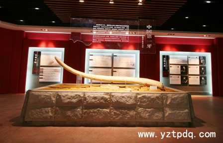 走進(jìn)寶應(yīng)博物館,一進(jìn)一樓大廳,就能看見(jiàn)一根象牙,長(zhǎng)420厘米,最大直徑22.2厘米,淺白色,月牙狀彎曲,表面平滑,為國(guó)內(nèi)出土同類化石之最,堪稱“中華第一牙”。這根象牙是2003年9月在寶應(yīng)夏集鎮(zhèn)境內(nèi)出土的,是一個(gè)古菱齒象牙化石,古菱齒象比猛犸象要大20萬(wàn)歲,體型比猛犸象還要大,是當(dāng)時(shí)地球上顯赫一時(shí)的“大象家族”。