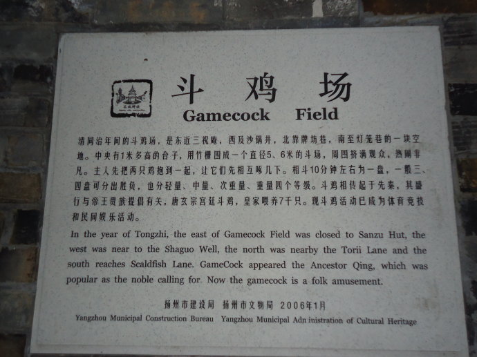 在揚(yáng)州東關(guān)街長(zhǎng)樂(lè)客棧南邊、在壺園的北面,找到了“斗雞場(chǎng)”,巷子不長(zhǎng),還拐了個(gè)90度的彎,不留心就會(huì)找不到。